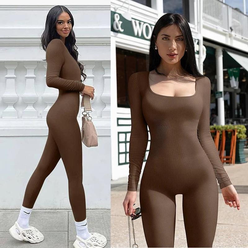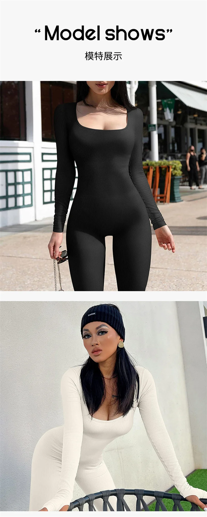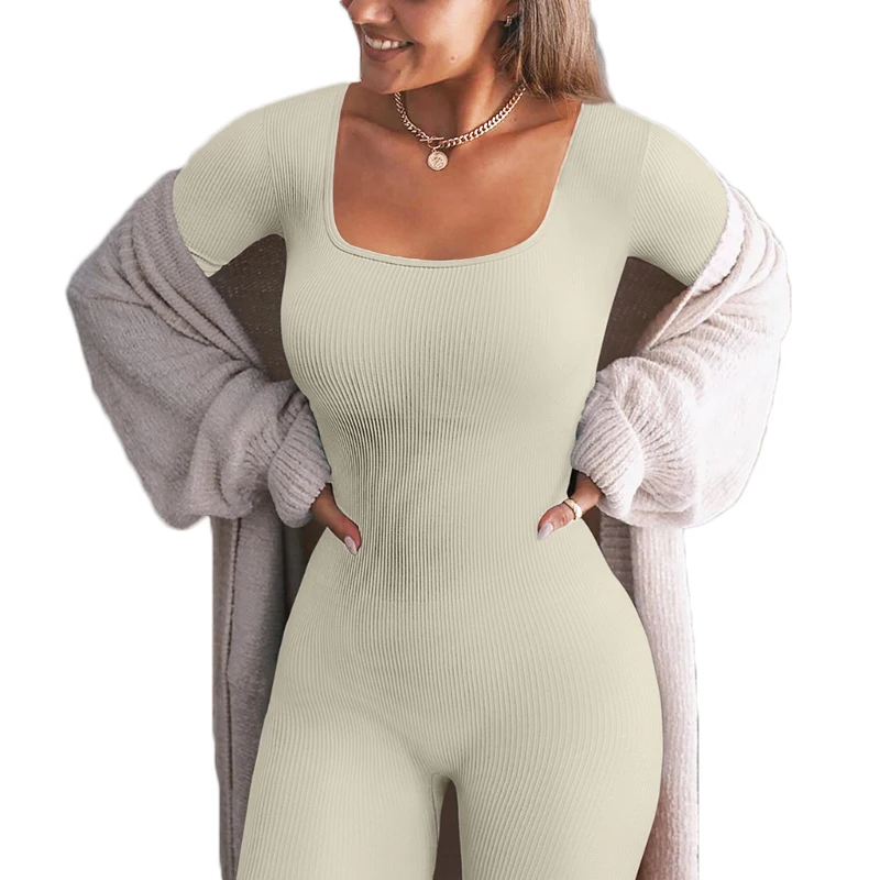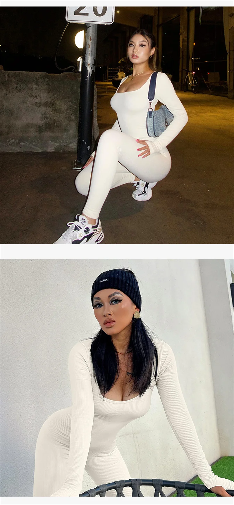 GUUDIA Padded Cup Jumpsuits Thumb Hole Ribbed Women Shapewear Long Sleeve Square Neck Sexy Bodycon Rompers One Piece Outfits